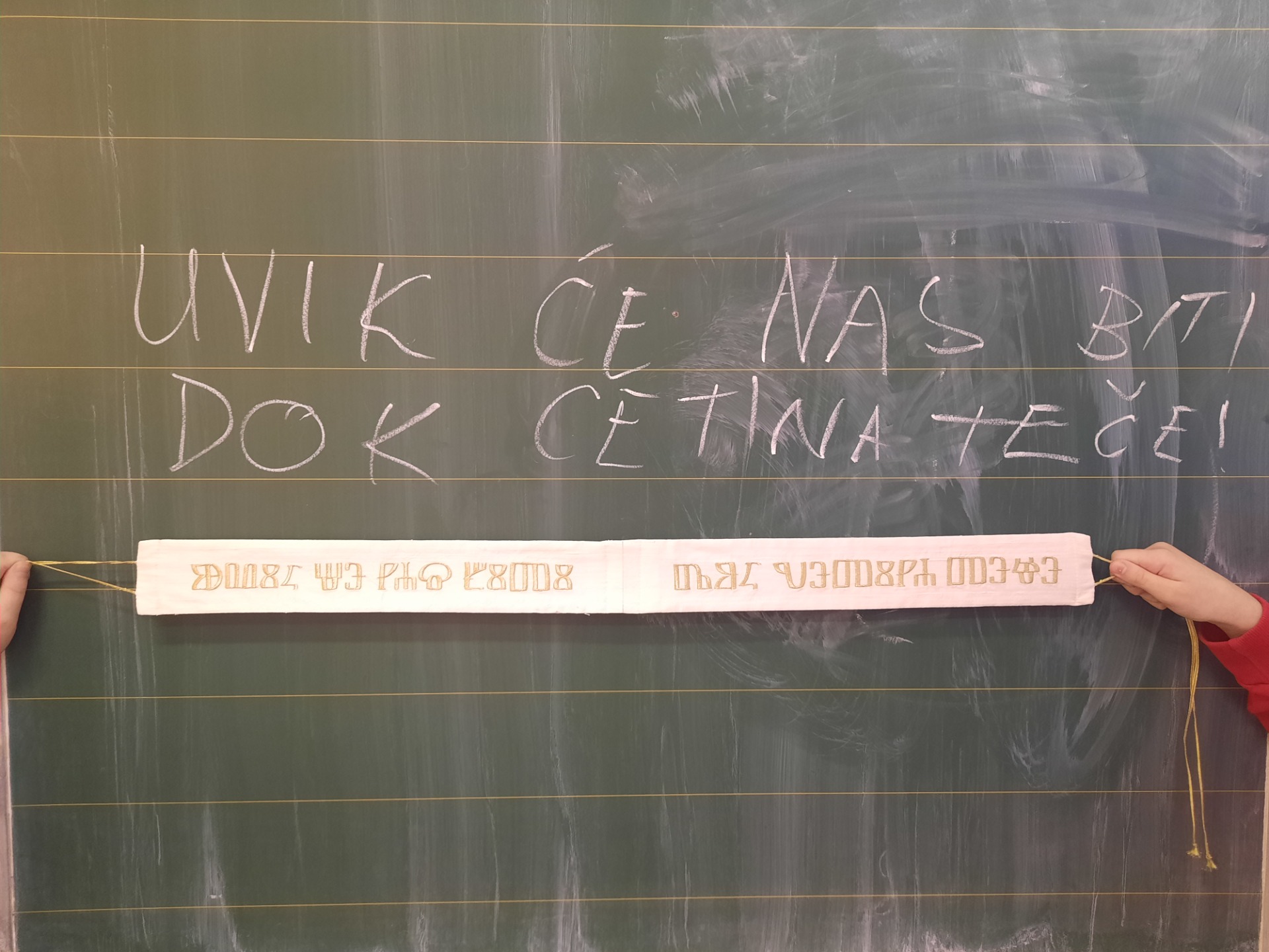 Učenici u šestom razredu uče o hrvatskom povijesnom pismu glagoljici u nastavi hrvatskoga jezika i povijesti. Na nastavi povijesti smo za ovaj dan vježbali glagoljicu pisati i prepoznavati slova, dešifrirali jedan glagoljski natpis, izrađivali glagoljična slova od papira koja smo izvjesili u predvorju škole. Tijekom nastave hrvatskoga jezika izrađivali smo male Bašćanske ploče s glagoljičnim natpisom.